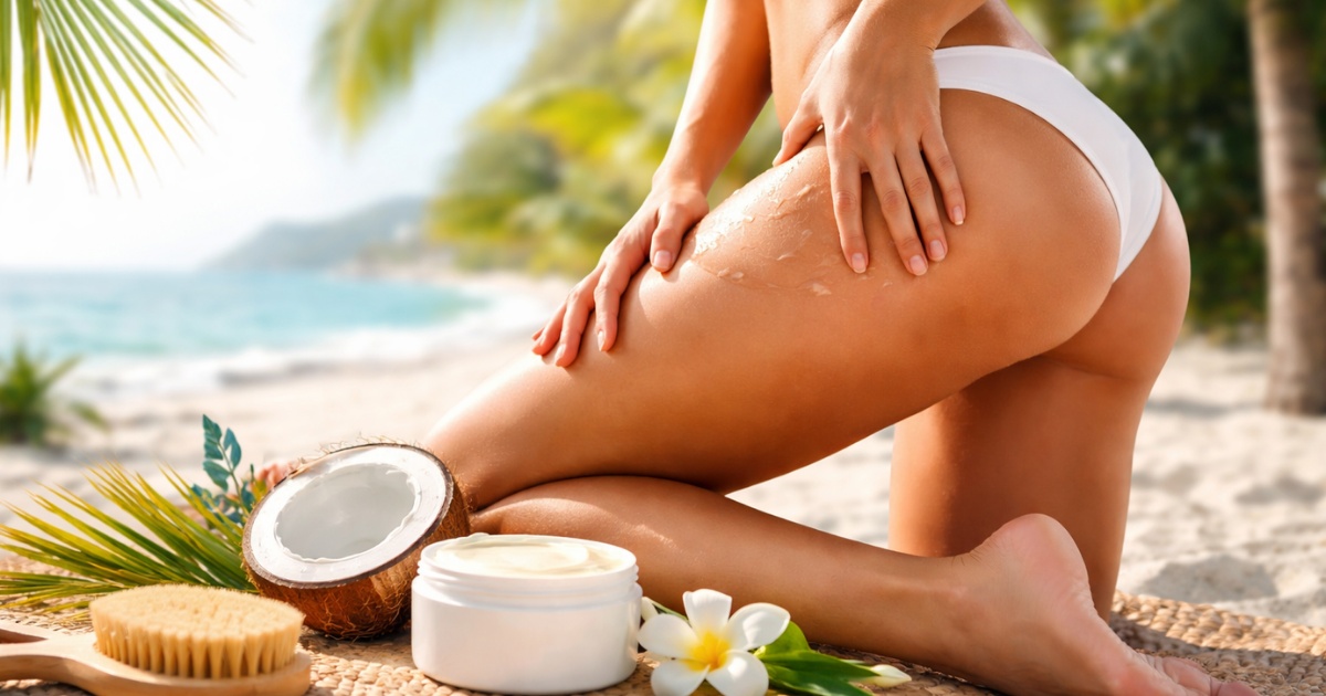 Woman applying coconut body scrub to thigh on a tropical beach with skincare products nearby.